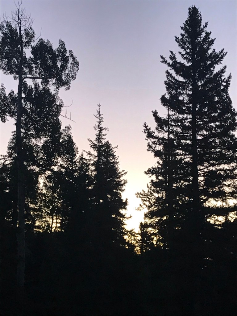 Through the big pine trees, the sky changed from dark to light. The top of the sky staying dark and the bottom of the pine trees starting to emit a flashlight yellow brightness. As the sun rose, it consumed the darkness.