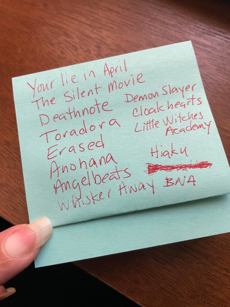 I wanted to have something to talk to my kids about. They quickly shared many thoughts on what my first show I should tip my toe into the world of anime. I was hesitant. I don’t know why, but my thought would be that I wouldn’t like it.